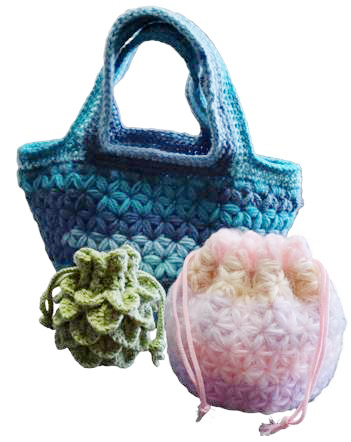 ハンドメイドはカラフルな糸を使った手編みの巾着を中心に用意しています。是非お気に入りを見つけてください。